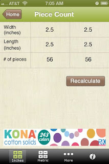 The cons? Well, for one thing, just like the Quiltivate website, this app defaults to fabric being 43 inches wide. This makes me grind my teeth. It also makes me want to go measure all of my Robert Kaufman fabric and see what it really measures. I'll bet it's not 43 inches! [I did measure. It's 43" unwashed and including the selvage.]